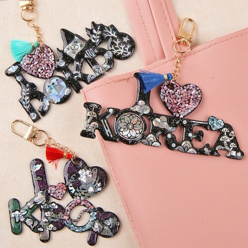 - F-05-419~421 / 3종 택1 / 자개스티커, 레진 별도 / 구성품 : 검정아크릴 + 태슬 + D링/