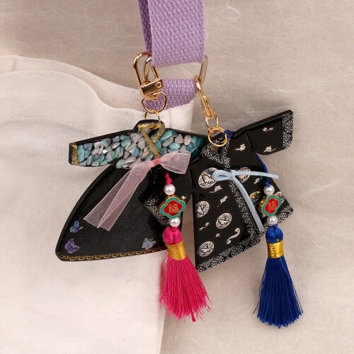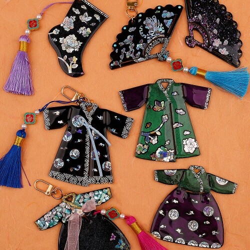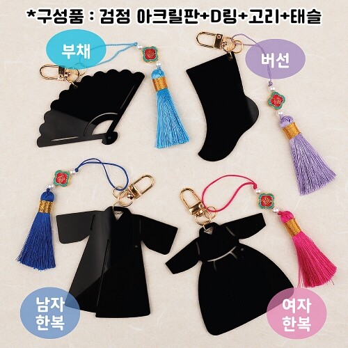 4종 택1 / 구성품외 부자재(스티커,자개 등) 별도구매 구성품 : 검정 아크릴판+D링+고리+태슬 남자 한복9.4x8.5cm, 여자 한복8.3x7.9cm, 부채9.8x5.6cm, 버선7.3x7.4cm, 두께3mm