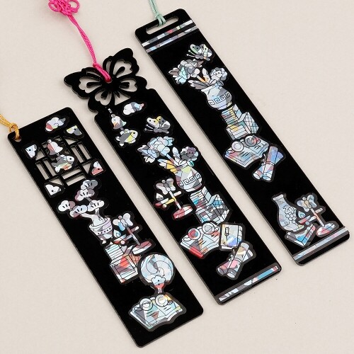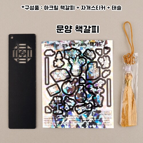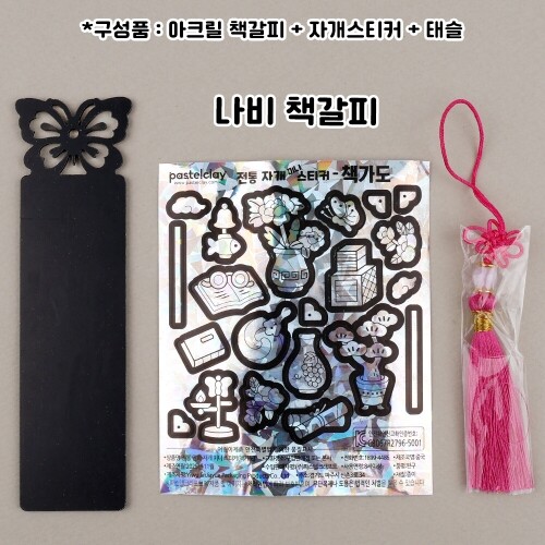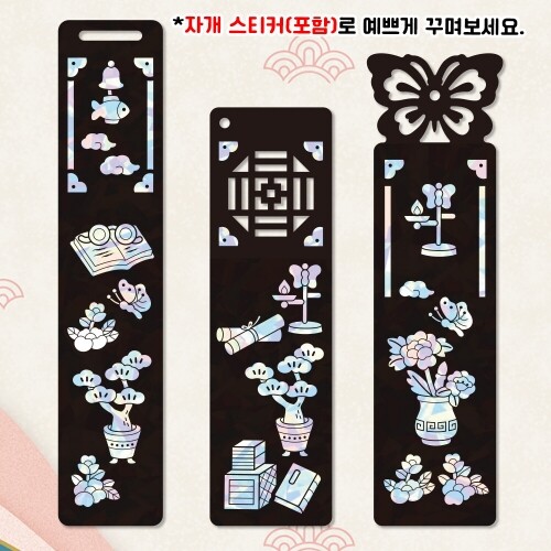 F-04-407~409 / 3종 택1 / 구성품 : 아크릴 책갈피 + 자개스티커 + 태슬 / 문양3.5x12.1cm, 나비3.5x13.6cm, 심플3x14.6cm