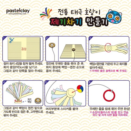 T-07-244 / 4x13cm / 구성품: 컬러 화지+우레탄줄+엽전+백업+플라스틱링+고무밴드+스티커 제기에 우레탄줄 고리를 달아 연습할 수 있고, 잘차게 되면 줄을 자르고 사용해요.