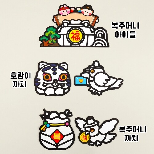 완제품이 아닌 DIY 만들기 제품입니다. / 머리띠 약11x12.5cm(성인,아동 착용가능), 호랑이 까치 9.8x9cm, 복주머니 까치 9.4x10.5cm, 복주머니 아이들 18.5x11.7cm |